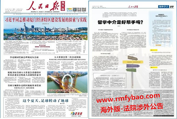 国内统一刊号:CN11—0066,国内代号:1—96,国外代号:D797 “人民日报海外版”发行意义是为在海内外读者服务,一带一路沿线国家及海外华人、华侨、港澳台同胞、在外的中资机构、留学生。关心中国情况的各国朋友以及来华旅游、探亲、学术交流、从事经贸活动的各界人士。国内党政机关、群团组织、企事业单位、学校等人员阅读。传达党中央政策,关注民生热点问题,介绍国际政治、经济、科技、教育、文化,提供国内外各种信息。 人民日报海外版向国内外公开发行,在北京编辑。远程传版印刷,国内印刷点有北京、成都、西安、上海、深圳、香港等地,国外印刷点有纽约、旧金山、东京、巴黎、多伦多、约翰内斯堡、雅加达等地。发行到世界80多个国家和地区。 人民日报海外版广告类型: 商务形象广告、宣传公益广告、报眼报花广告、报纸分类广告、软文文字广告、数字报广告等等.... 中缝广告:法院公告、海事法院公告、知识产权法院公告、证件遗失声明、解除劳动合同公告、通知公告、寻人启事、仲裁委公告、仲裁监察大队公告等等...... 人民日报广告热线:010-61429368 QQ:1940507704 联系人:李顺 15010325567
